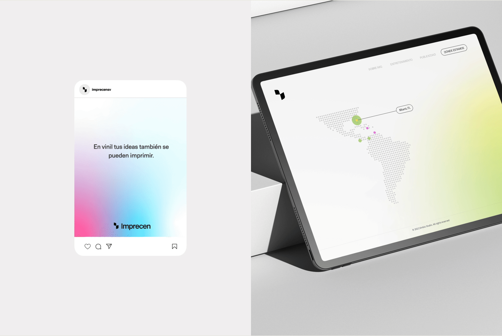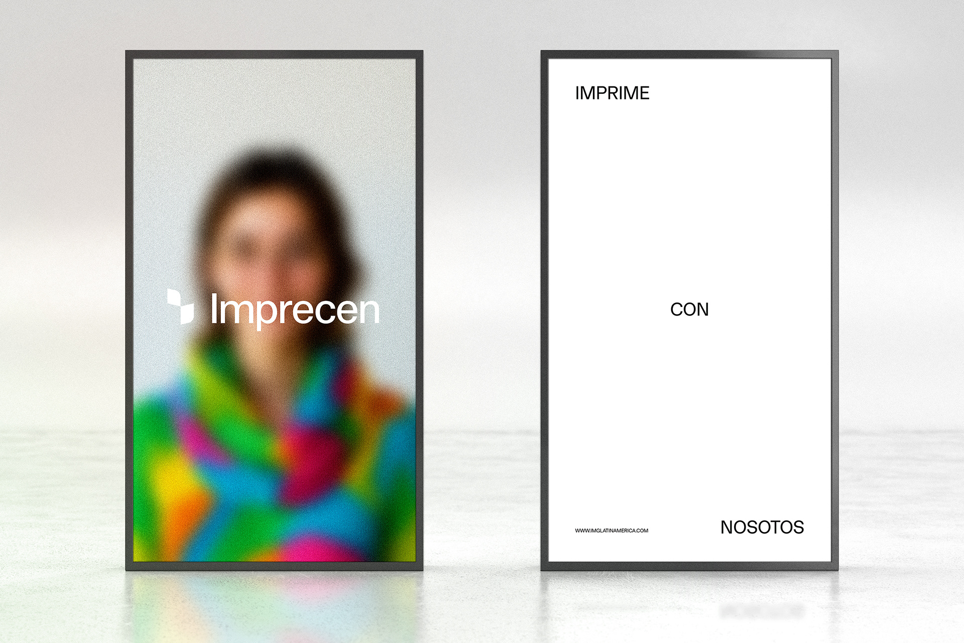 El logotipo de Imprecen es un isotipo tipográfico que utiliza exclusivamente el nombre de la marca como elemento visual central. Esta decisión concentra la atención en una tipografía cuidadosamente diseñada. Uno de los rasgos más singulares del logotipo es el punto de la letra “i”, cuya forma se aleja de la geometría convencional. Su trazo más libre y curvo introduce un gesto visual que sin representar nada de forma literal, puede recordar sutilmente a una gota de tinta, como aquellas propias del mundo de la impresión. Esta pequeña variación aporta dinamismo y refuerza el vínculo conceptual con el oficio gráfico. El color azul actúa como eje central de la identidad y se expande mediante una paleta complementaria de cinco colores, rojo, verde, morado, anaranjado y amarillo. Estos colores se distribuyen en proporciones equitativas y están pensados para aportar variedad y versatilidad visual a cada aplicación de la marca. Representan la diversidad de posibilidades cromáticas que Imprecen es capaz de materializar. En conjunto, la identidad visual de Imprecen transmite un equilibrio entre solidez institucional y libertad creativa. Es una marca que no solo imprime, da visibilidad a lo que otros imaginan.